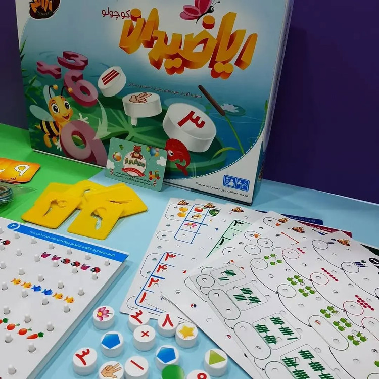 یک عدد صفحه بازی،۱۲کارت آموزشی دورو،۱۹۲عدد مهره آموزشی،یک بسته کارت اعداد و علائم ریاضی،یک بسته شابلون اعداد و۲۰ عدد کش رنگی
