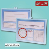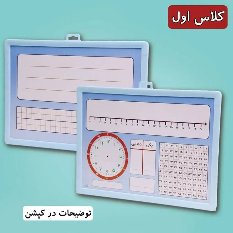 1️⃣ریاضییار کلاس اول روی دو طرف آن تقریباً تمامی جداول و الگوهایی که برای دانشآموزان کلاس اول ابتدایی لازم است، از جمله یک محور اعداد، جدول اعداد ۱ تا ۱۰۰، جدول ارزش مکانی یکی و دهتایی، تساوی جمع و تفریق و تصویر یک ساعت بدون عقربه و دارای ارقام ساعتشمار و دقیقهشمار برای آموزش ساعت وجود دارد. با استفاده از این تخته، تجربه تمرین ریاضی به یک تجربه شیرین تبدیل میشود. در گوشهی تخته جایی هم برای ثبت نام و نام خانوادگی کودکان در نظر گرفته شده تا کلاس اولیها مراقب تختهی خودشان باشند.