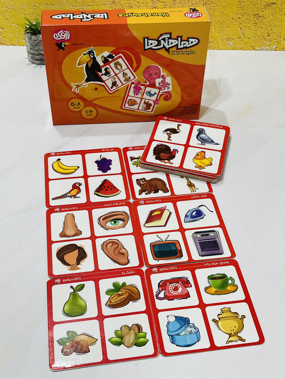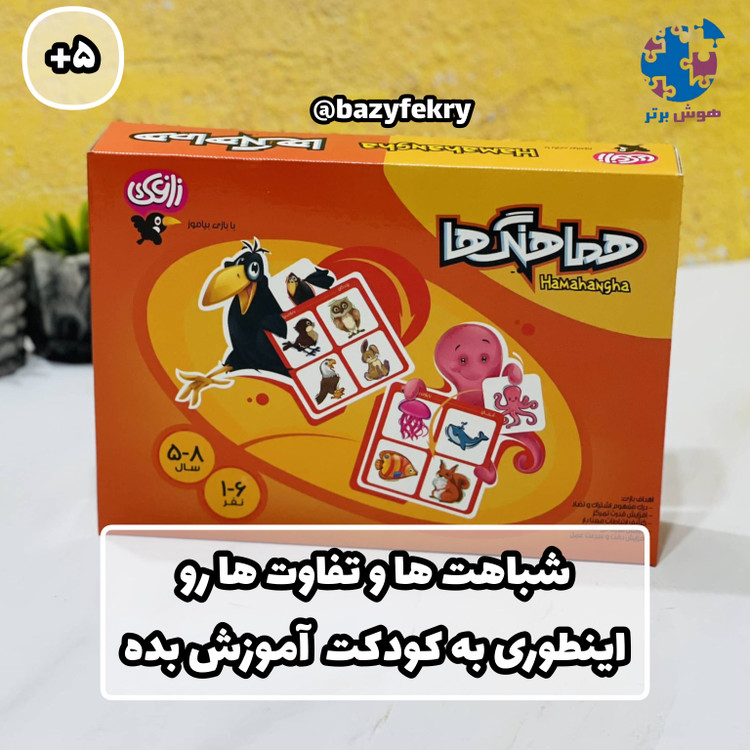 درک شباهتها و تفاوتهای بین اشیاء، جانداران و انسانها یکی از مراحل بسیار مهم رشد در کودکان محسوب میشود. بزرگترها میتوانند با روشهای گوناگون و با استفاده از وسایل و بازیهای آموزشی مناسب توجه کودکان را به تفاوتها و شباهتها جلب کرده، این روند را تسریع کنند. مجموعه هماهنگها یکی از ابزار بسیار مفید در خدمت این هدف است. روی هر کارت بزرگ چهار تصویر وجود دارد که سه مورد از آنها از یک یا چند جهت به هم شبیه هستند و یکی از تصاویر از این جهات با آنها متفاوت است. کودک باید وجه شباهت و کارت کوچکی را که حاوی تصویری شبیه سه تصویر مشابه است، پیدا کند و کارت کوچک را روی تصویر متفاوت بگذارد. در بالای هر یک از کارتهای بزرگ وجه تشابه مورد نظر نوشته شده است تا بزرگترها بتوانند کودک را راهنمایی کنند. این محصول برای گروه سنی 5 تا 8 سال و تعداد 1 تا 6 بازیکن مناسب است.