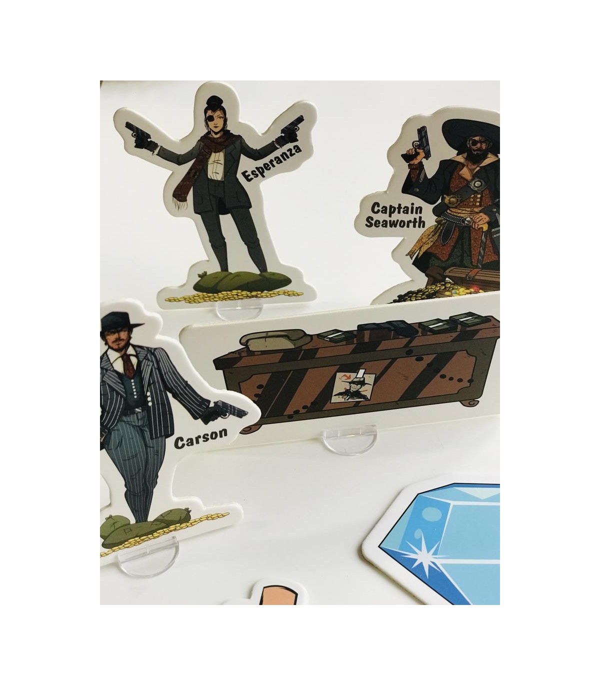 - بَنگ!: بازیکنِ هدف، زخمی میشود (و یک توکن زخم دریافت میکند)! او یک زخم برداشته و کاراکتر خود را روی زمین میخواباند. بازیکنانی که در یک دور، گلوله خورده و زخمی میشوند، نمیتوانند در تقسیمِ غنائمِ آن دور، شرکت کنند!