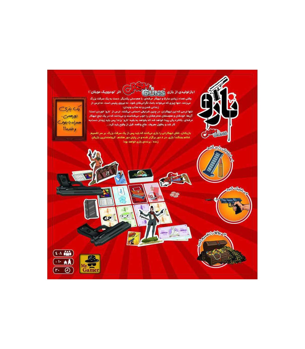 در بازی فکری Cash n Guns (نارو) میتوانید سکانسهای هیجانانگیز فیلمهای سینمایی را در فضایی واقعی تجربه کنید. هدف در بازی رومیزی نارو این است که پس از ۸ دور بازی، بیشترین پول را جمع کرده و همچنان زنده مانده باشید.