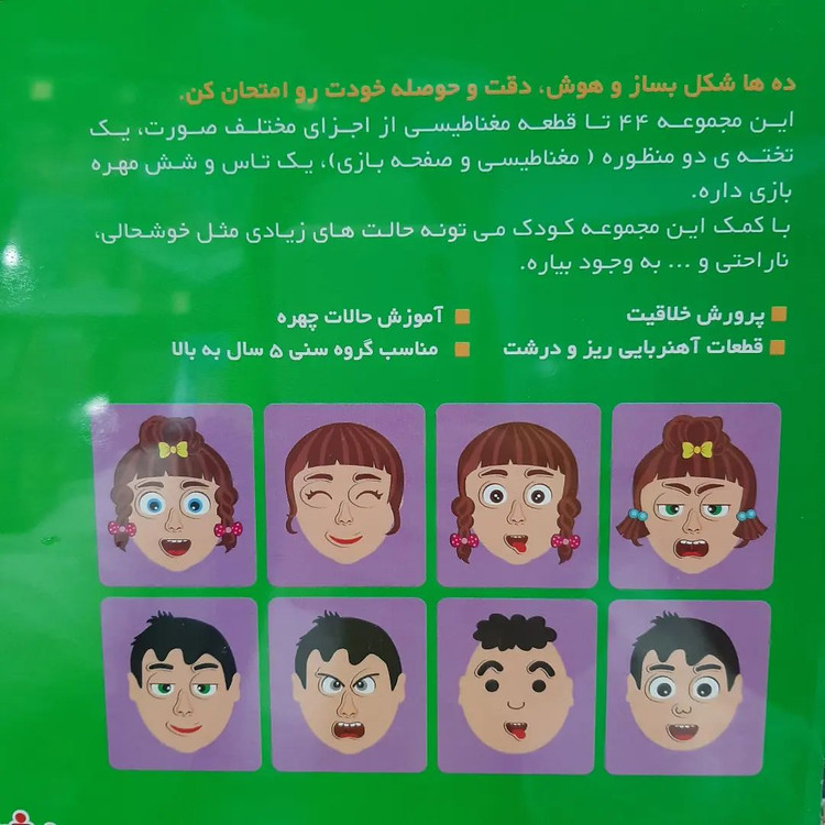این محصول از سری جورچین های آهنربایی، امکان ترکیب اجزای سر را برای کودکان فراهم میاورد.